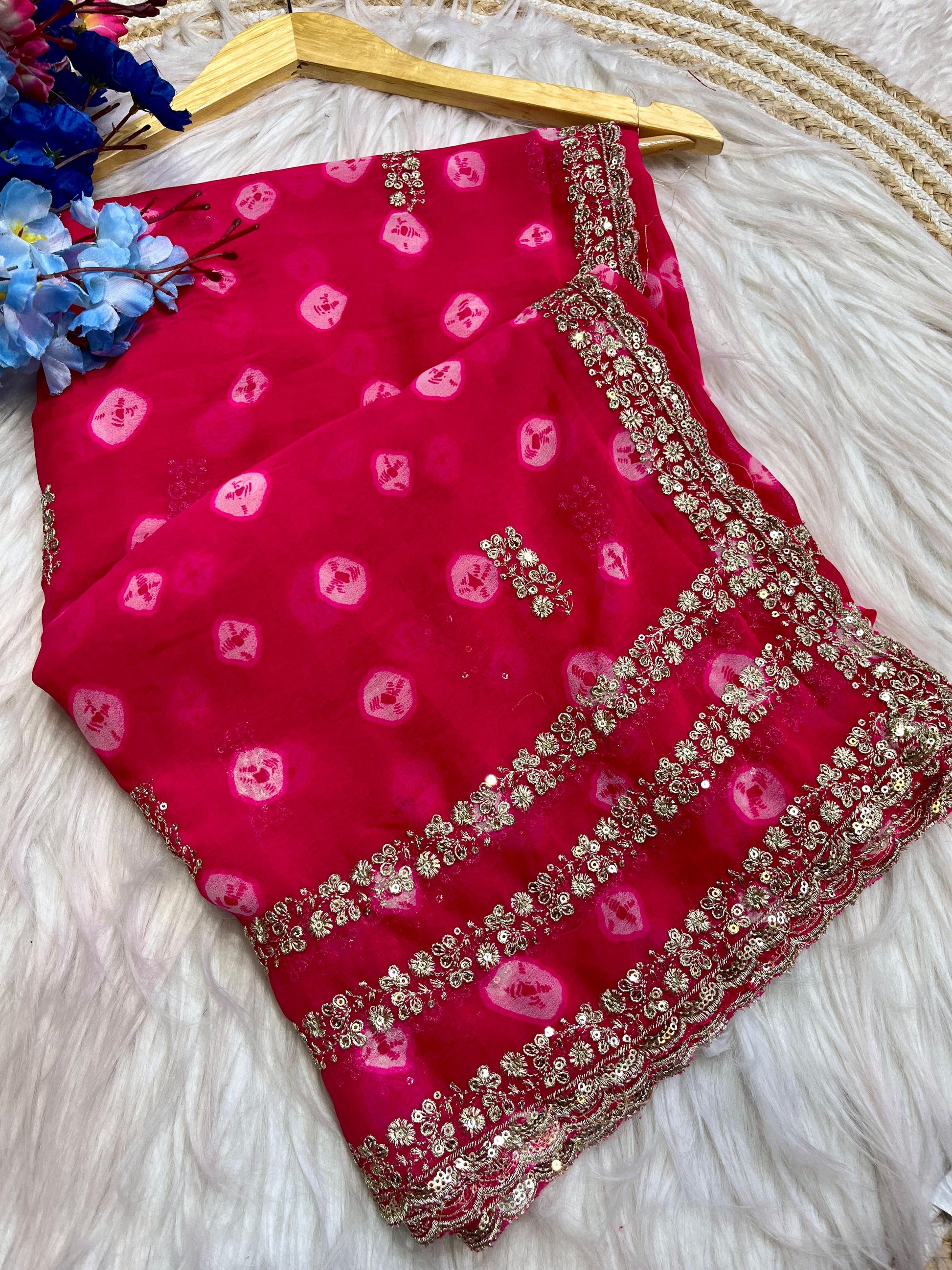 Elevate your ethnic style with this stunning authentic Gujarati Bandhej print saree beautifully crafted in lightweight georgette fabric for a graceful drape. Featuring Botta Patti work – traditional dot or floral motifs that add cultural richness and charm – this saree is perfect for festive occasions, cultural gatherings, or casual celebrations.