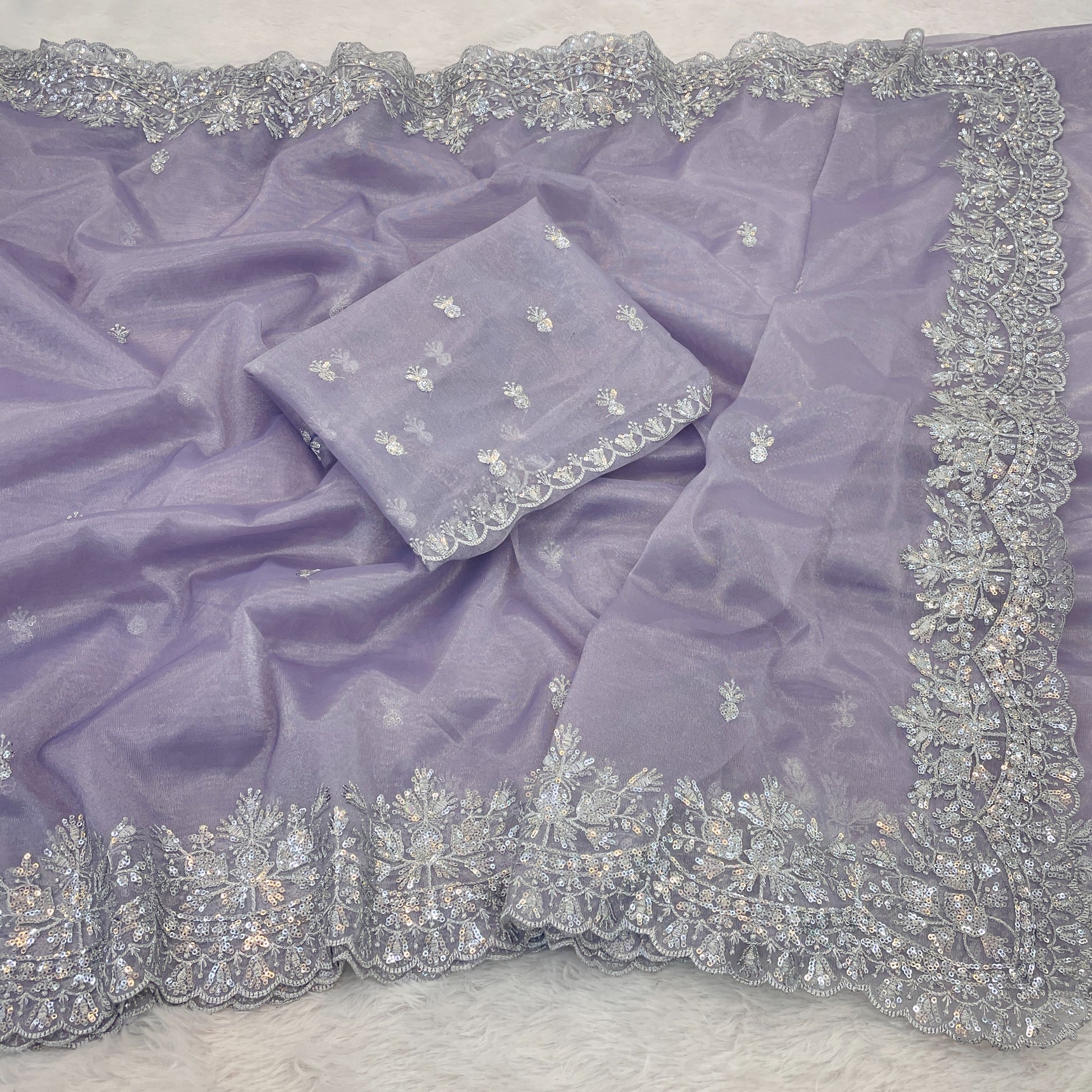Grace meets sophistication in this beautiful lavender saree crafted from twill net fabric offering a delicate, flowing drape with a subtle texture. The saree is elegantly highlighted with silver hand embroidery along the border adding a refined shimmer and artisanal touch that enhances its ethereal appeal.