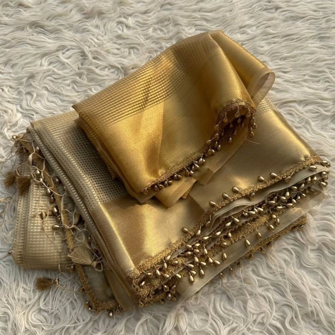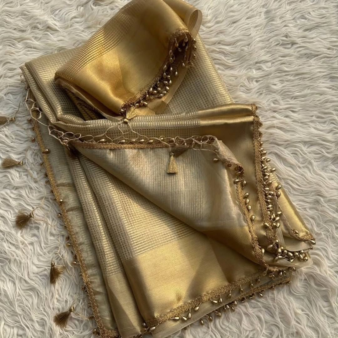 Chic Golden Saree with Latkan on Pallu and Box Thread Design