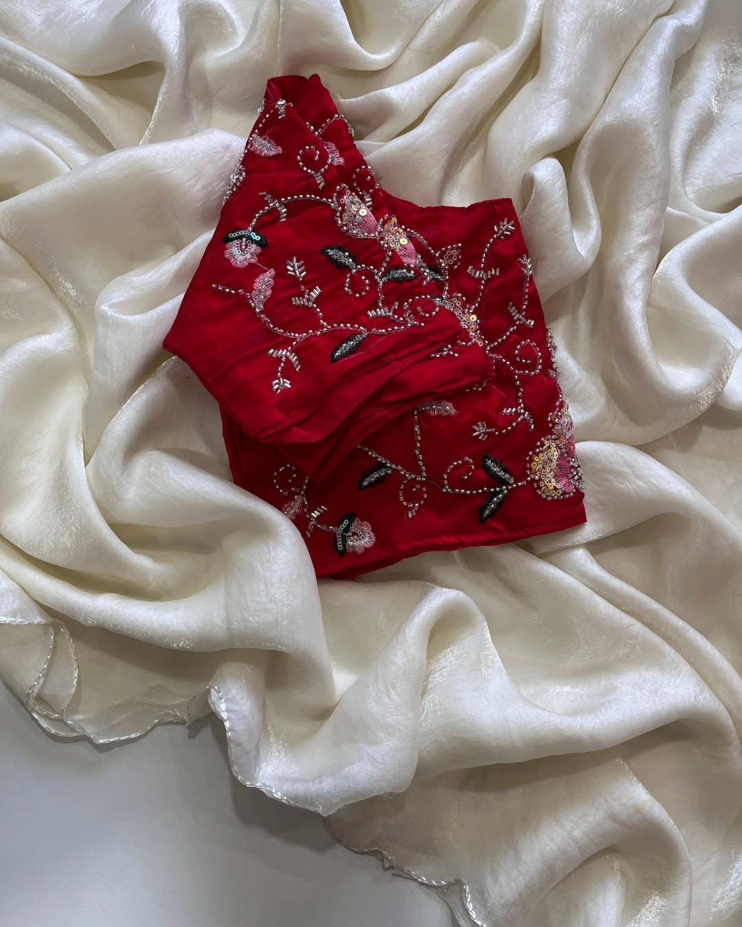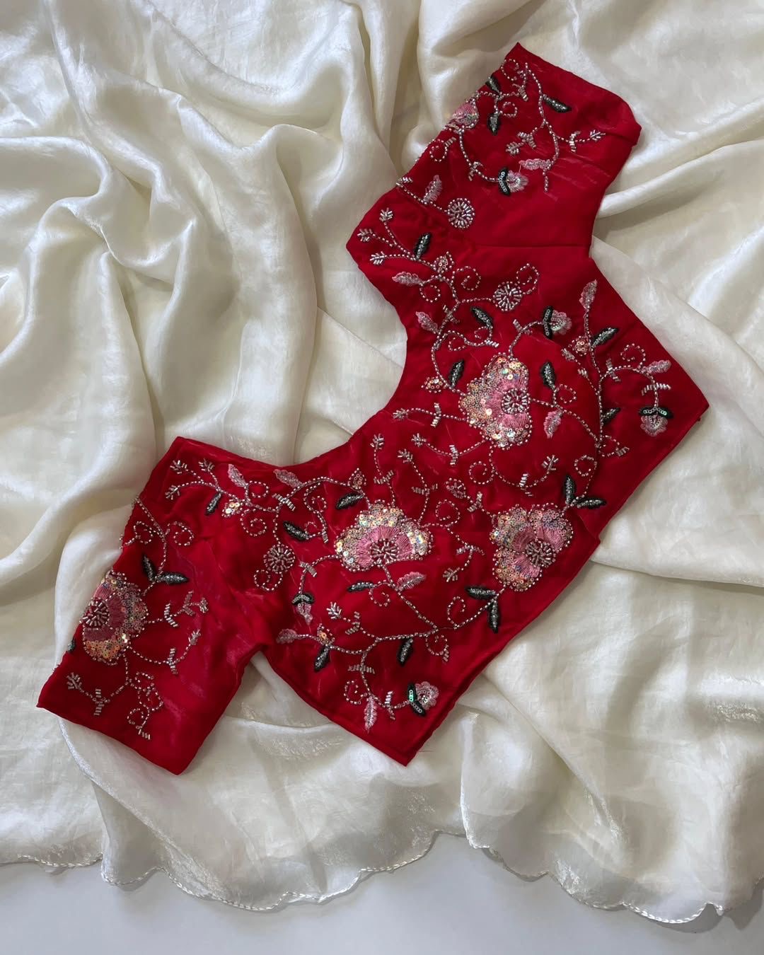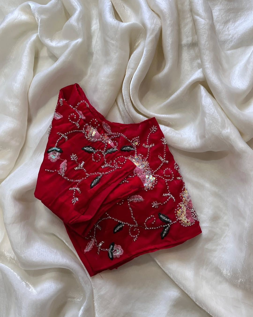What sets this ensemble apart is the beautifully embroidered blouse which adds a touch of intricate craftsmanship and contrast to the minimalistic saree. The pairing of a plain saree with a detailed blouse creates a balanced and stylish look.