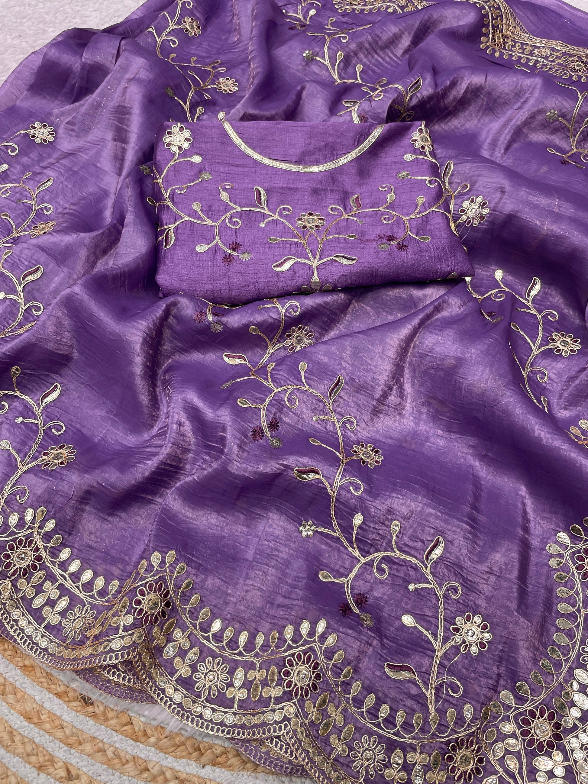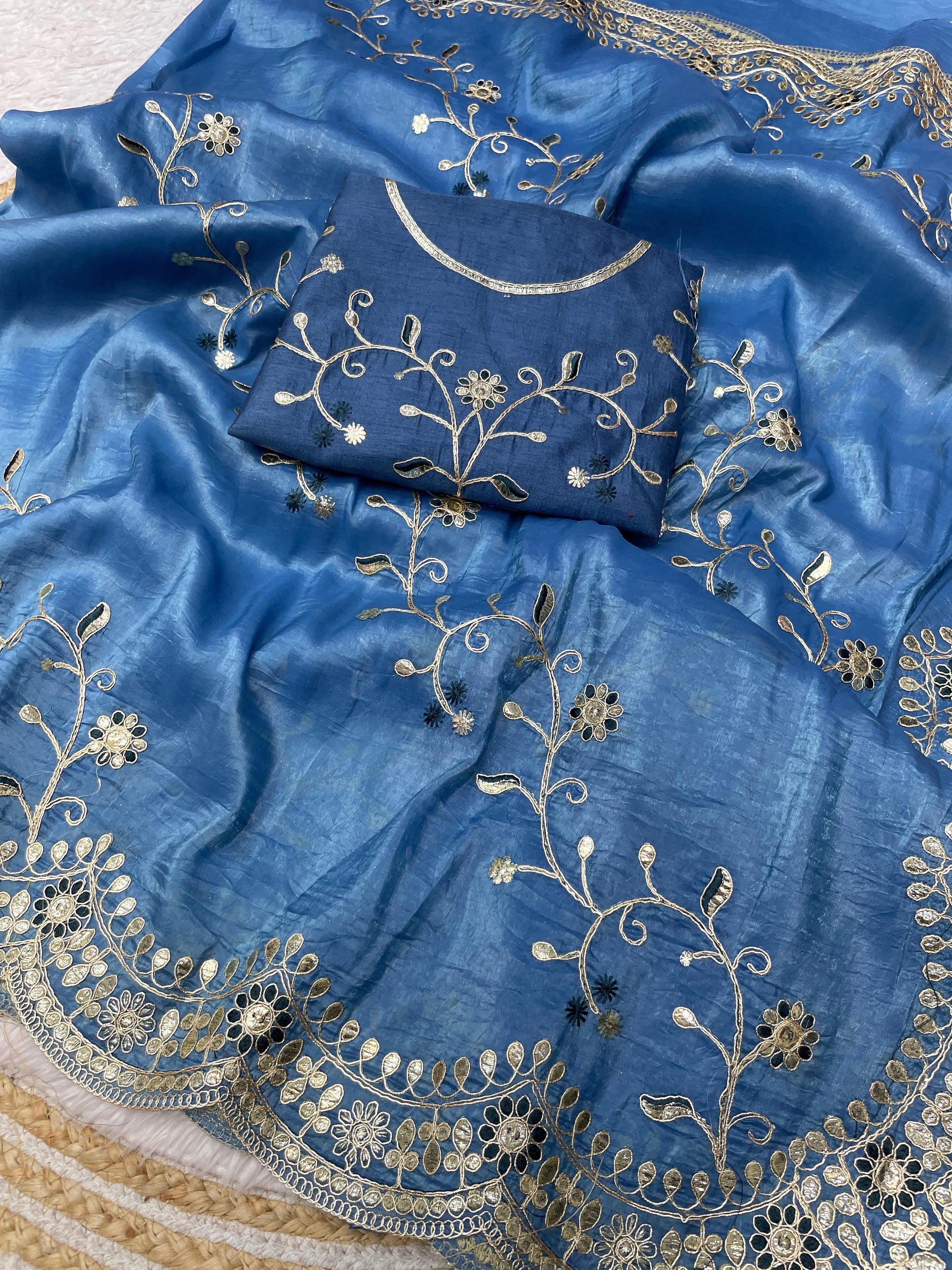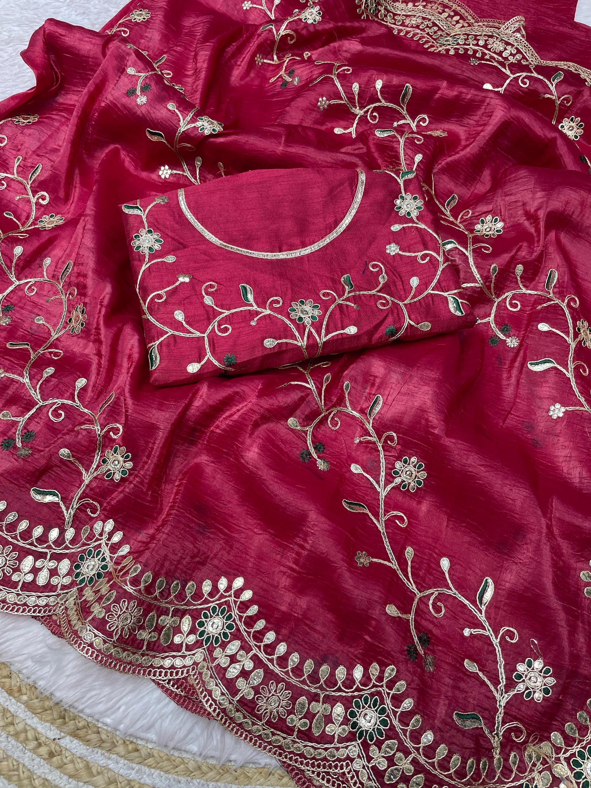 The saree is adorned with classic Botta Patti work a traditional Gujarati design characterised by intricate floral or geometric motifs spread across the body. Each motif is carefully crafted to give the saree a handcrafted, ethnic charm. The pallu and border are tastefully embellished enhancing the overall richness without overpowering the subtle beauty of the crush texture.